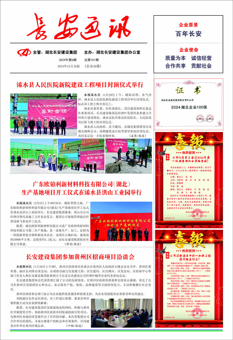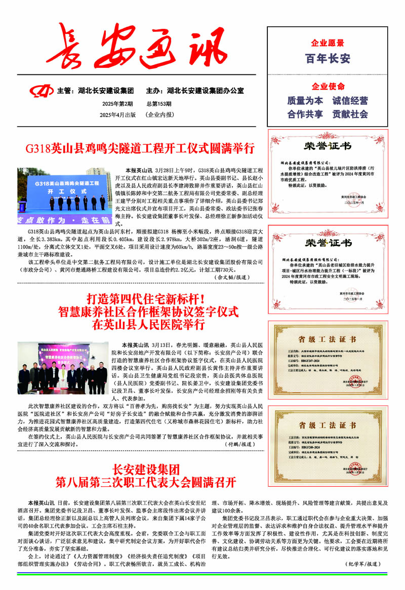 • 2025-11-03 長(zhǎng)安建設(shè)集團(tuán)聘任徐正新同志為湖北長(zhǎng)安建設(shè)集團(tuán)股份有限公司總經(jīng)理、余招剛同志為英山縣長(zhǎng)安房地產(chǎn)開(kāi)發(fā)有限公司總經(jīng)理